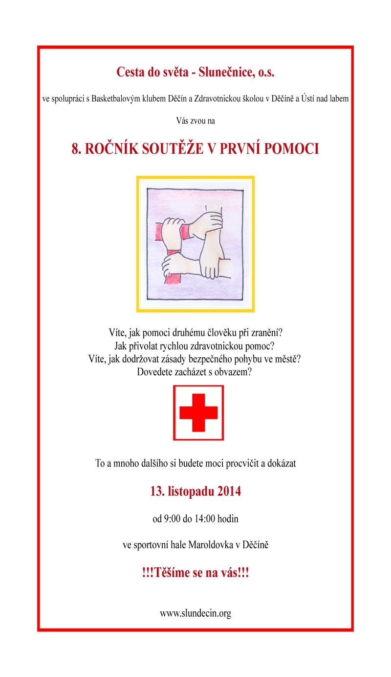 Ve čtvrtek 13. 11. 2014 se v prostorách Čez sportcentra v Maroldově ulici od 09:00 do 14:30 uskuteční již osmý ročník Soutěže v 1. pomoci pro družstva a jednotlivce se zdravotním postižením z celého regionu. Tuto soutěž již tradičně pořádá pobočný spolek Cesta do světa – Slunečnice, o.s. ve spolupráci s dobrovolníky z Dobrovolnického centra – Slunečnice, o.s. a studenty Střední zdravotnické školy v Děčíně, VOŠ zdravotnické v Ústí nad Labem a se značnou podporou sponzorů.