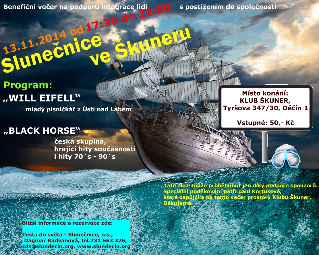 Od 17:30 do 22:00 hod pak zveme všechny na party, která se tentokrát koná na jiném místě a to v děčínském Škuneru, pod názvem „Slunečnice ve Škuneru“. Tato benefiční akce na podporu integrace lidí s postižením do společnosti bude opět vyvrcholením soutěže a závěrem celého dne! Tentokrát jsme večer pojali hudebně, a tudíž se bude hlavně tančit a to v doprovodu dvou hlavních kapel: Willa Eifella – mladého písničkáře z Ústí nad Labem a kapely Blackhorse, která hraje hity minulý i současných let domácí i zahraniční scény.