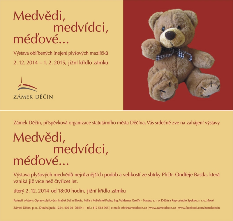 Také v letošním roce je pro návštěvníky připravena celá řada kulturních akcí pro všechny věkové kategorie. „Držíme se osvědčeného rozdělení adventních víkendů na sobotní pohádkové odpoledne věnované dětem a nedělní koncertní podvečer pro dospělé,“ zve na zámek ředitelka Iveta Krupičková. Cyklus adventních koncertů začíná tento rok v neděli 30. 11. od 19:00 hodin, kdy zámeckou kapli sv. Jiří rozezní oblíbený pěvecký soubor Collegium Verbascum. V jeho podání si vyslechneme renesanční a barokní skladby určené právě pro předvánoční čas od známých i méně známých mistrů například Adama Michny z Otradovic, Giovanniho Pierliugiho da Palestrina atd. O dva dny později, v úterý 2. 12. se pro malé i velké návštěvníky otevře výstava plyšových medvědů všech různých podob a velikostí. Uvidíte chlupáče z řady evropských zemí, v oblečcích, uniformách a s různou výbavou ze sbírky pana PhDr. Ondřeje Bastla. Vernisáž výstavy začíná v 18:00 hodin. Výstava plyšových medvídků potrvá až do 1. února 2015 a bude umístěna v přízemí jižního křídla.