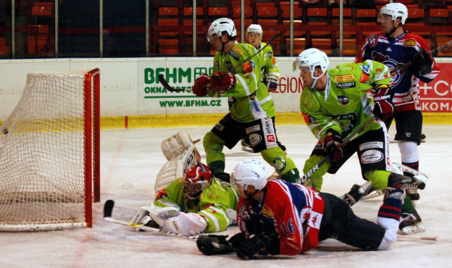 tu následně přetavil ve vedoucí branku – 1:0. Na tu druhou se nemuselo příliš dlouho čekat. O čtyři a půl minuty později totiž Medvědi udeřili znovu. Při hře 4 na 4 v rohu kluziště vybojoval puk ONDŘEJ HŘÍBAL, který si nabruslil až před brankáře hostí Čápa a dokázal ho prostřelit – 2:0. V polovině první třetiny pak vyslal Kastner jedovatou střelu na Lavingera, ale děčínský brankář jeho velkou šanci zneškodnil. S brankami v první periodě se roztrhl pytel ještě v rozmezí čtrnácté a patnácté minuty, kdy Medvědi přidali další dva přesné zásahy. Nejprve přidal další branku znovu ONDŘEJ HŘÍBAL, jenž Čápa překonal blafákem v samostatné akci – 3:0 a po něm pak také další obránce JAN FILIPOVSKÝ rozvlnil hostující síť a vyhnal Čápa z branky, jehož nahradil Jeschke – 4:0. V závěru první třetiny ještě zlikvidoval Lavinger dvě střely Bartoně a zachoval si tak prozatímní čisté konto.