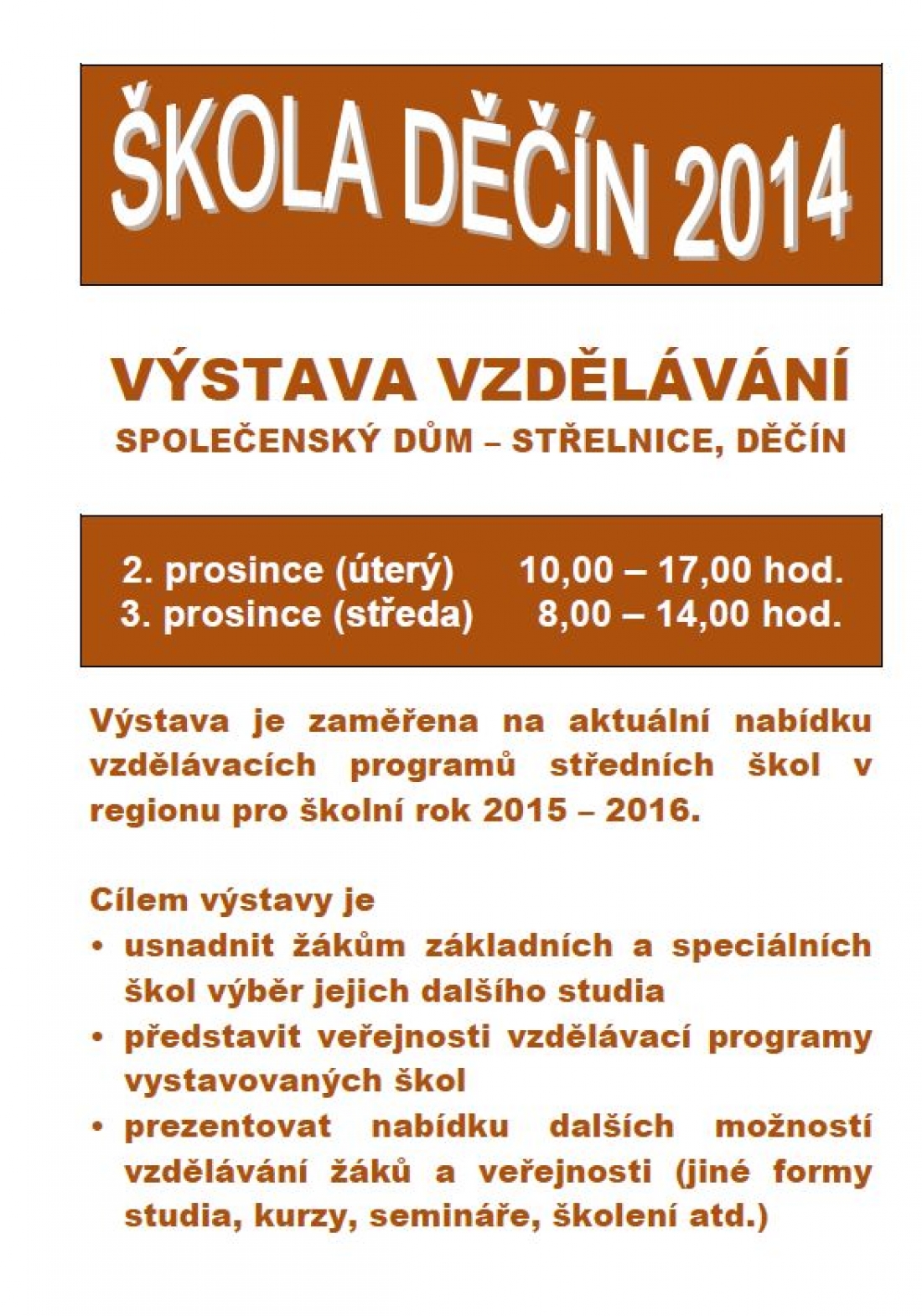 Ve dnech 2 a 3. prosince 2014 se ve Společenském domě Střelnice koná tradiční výstava vzdělávání ŠKOLA DĚČÍN 2014. Výstava je zaměřena na aktuální nabídku vzdělávacích programů středních škol v regionu pro školní rok 2015 – 2016.