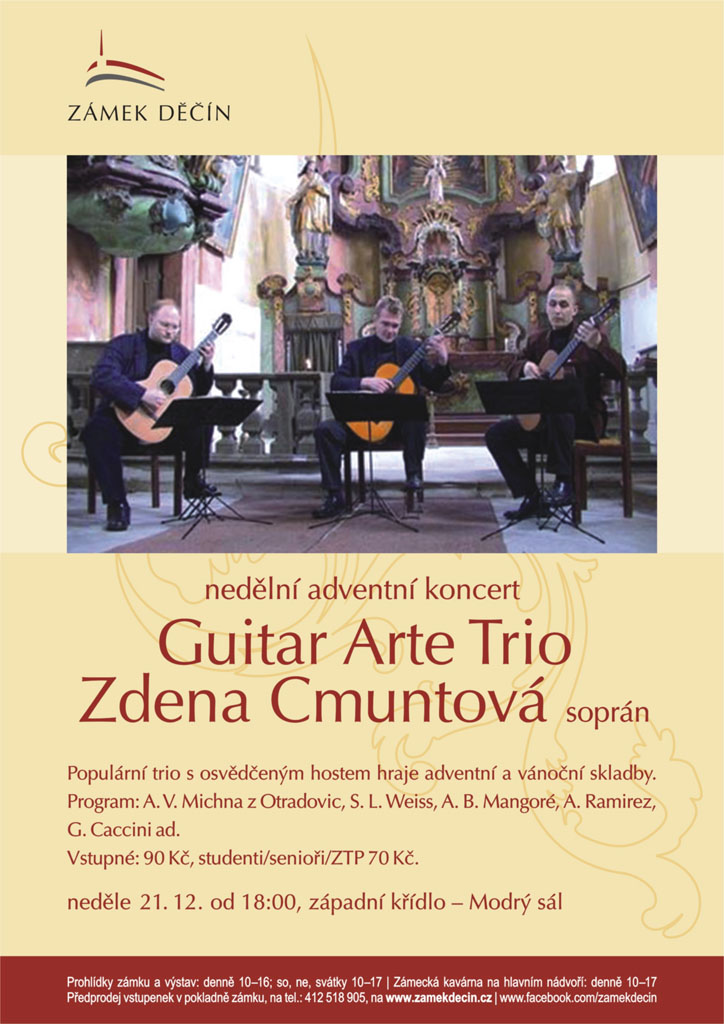 Čtvrtý nedělní adventní podvečer 21. 12. můžete strávit s oblíbenou kytarovou sestavou Guitar Arte Trio a sopranistkou Zdenou Cmuntovou. Adventní a vánoční skladby A. V. Michny z Otradovic, G. Cacciniho S. L. Weisse, A. B. Mangorého a dalších se rozezní v Rohovém sále v západním křídle zámku v 18 hodin.