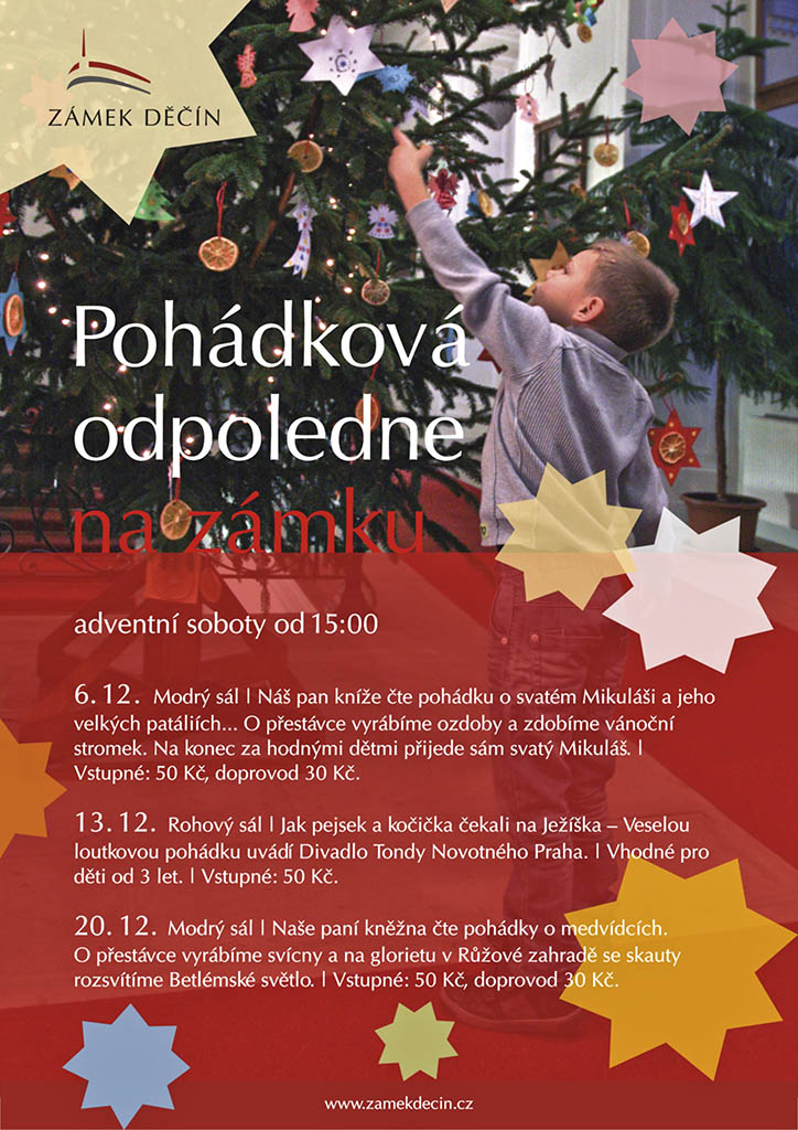 Také poslední adventní sobotu 20. 12. v 15 hodin zveme všechny malé návštěvníky do Modrého sálu v západním křídle zámku. Naše paní kněžna, kterou můžete dobře znát z vánočních prohlídek, bude vyprávět pohádky o medvědech a medvídcích. Ve výtvarné dílně budeme i letos vyrábět svícny a lucerničky, abyste si do svých domovů mohli odnést Betlémské světlo, které společně se skauty rozsvítíme na glorietu v Růžové zahradě.